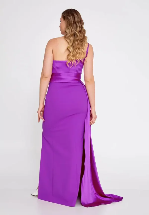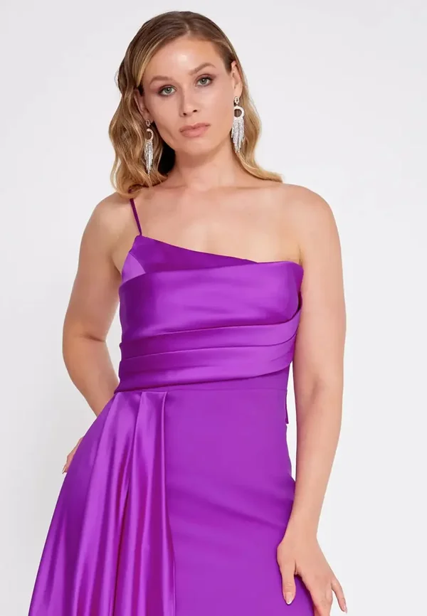 Na slici je dugačka ljubičasta satenska svečana haljina . Ovaj model karakterizira asimetrični gornji dio s jednom naramenicom i drapiranim (nabranim) detaljima na torzu. Haljina ima visok prorez na nozi i ukrasni naborani materijal (volan) koji pada niz jednu stranu, stvarajući elegantnu siluetu.