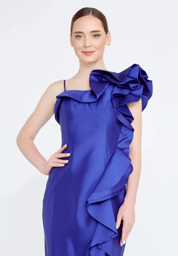 Detalji: Na jednom ramenu nalazi se upečatljiv volan ili detalj u obliku cvijeta koji se proteže niz gornji dio haljine.
