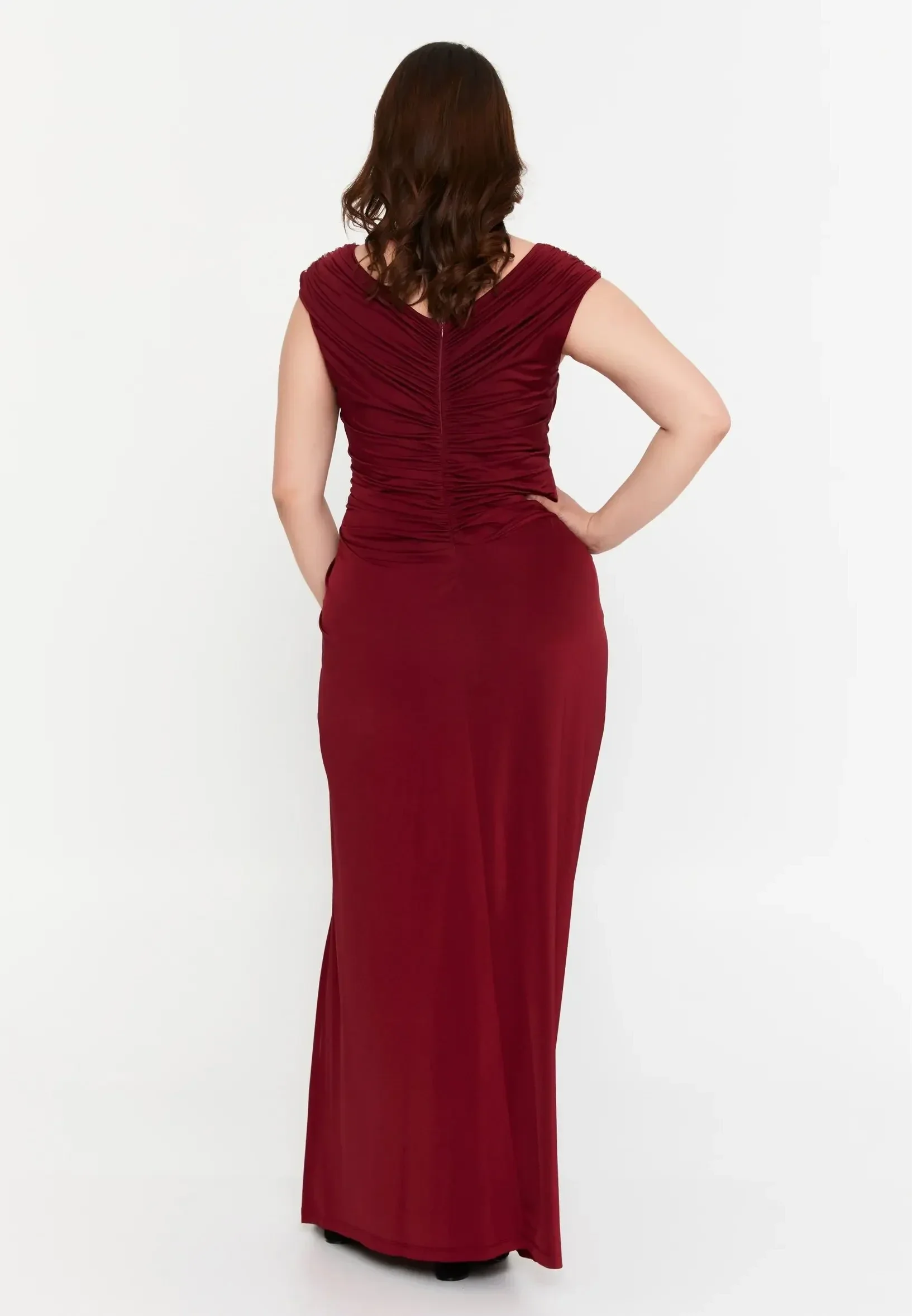 Ova haljina je duga bordo večernja haljina za punije osobe s V-izrezom, naborima (draperijom) i ukrasnim detaljima od kamenčića na ramenima i struku. Haljina je izrađena od rastezljivog materijala (likra ili šifon) i ima visoki prorez na nozi. Ključne značajke:
