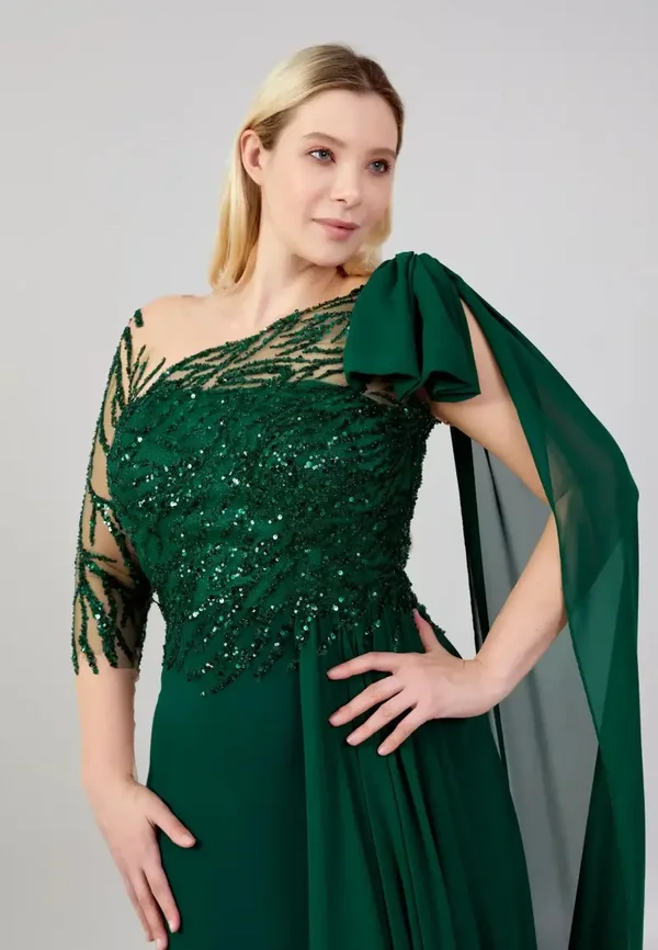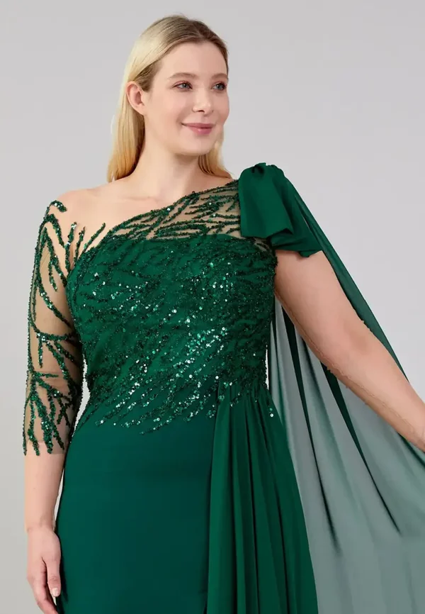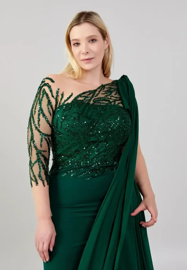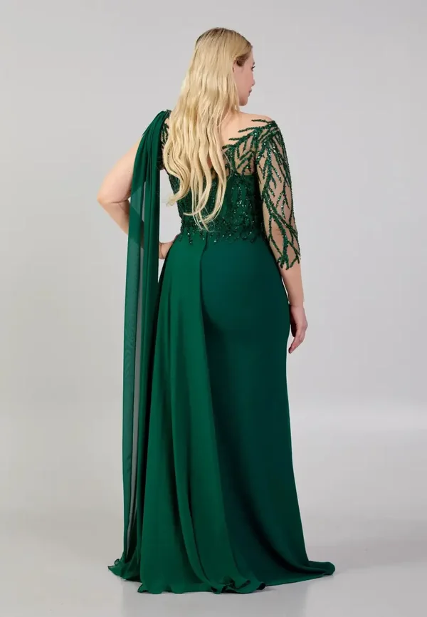 Ova haljina je duga tamnozelena (zagasito zelena) svečana haljina za punije osobe s asimetričnim dizajnom, prozirnim rukavom s vezom i dugim plaštom od tila. Karakteristike proizvoda: