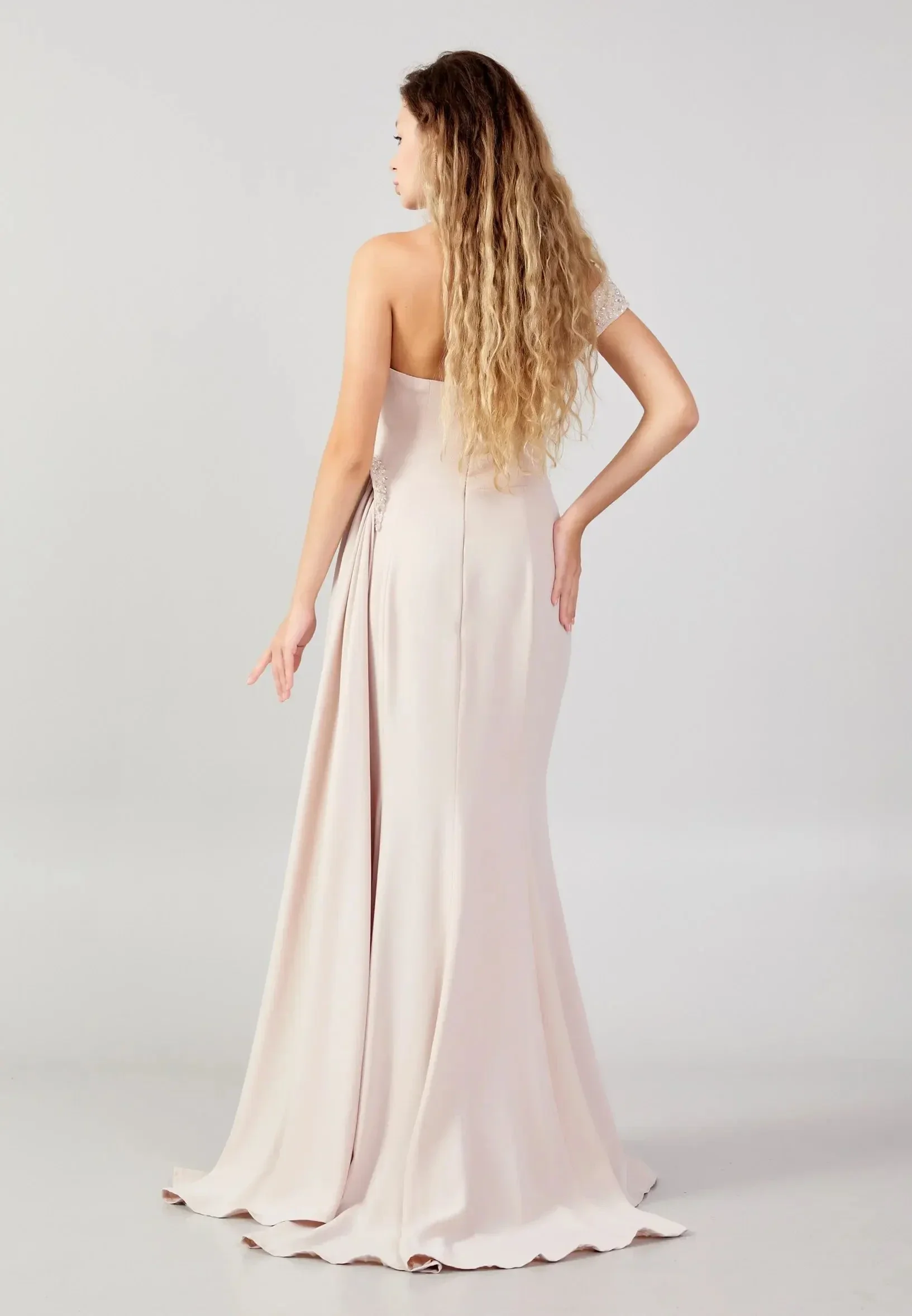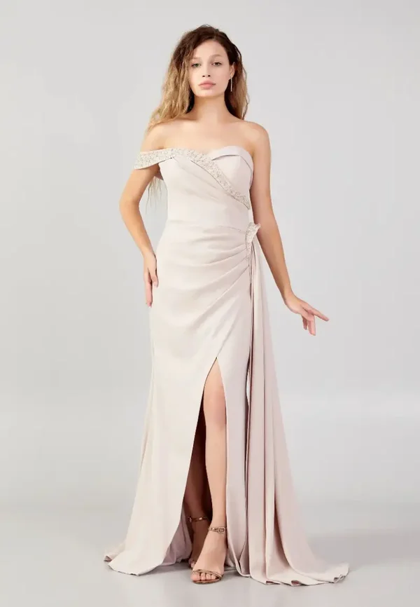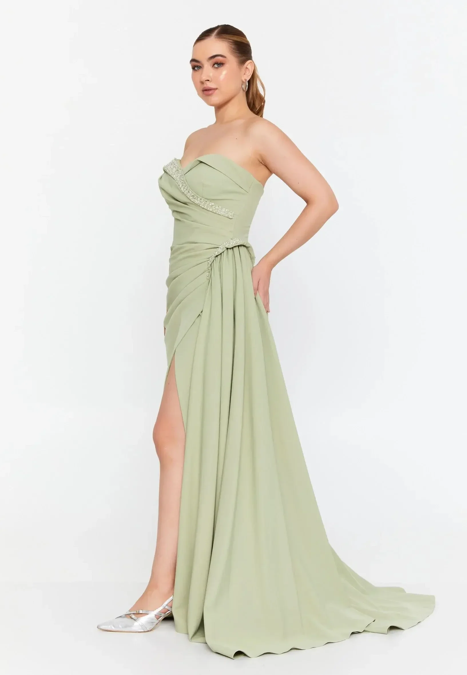 Ova haljina je dugačka svečana haljina u mint zelenoj boji (nijansa sage green ili pistachio ), ili bež boji koju karakterizira elegantan asimetrični dizajn s naborima i ukrasnim biserima. Detalji dizajna:
