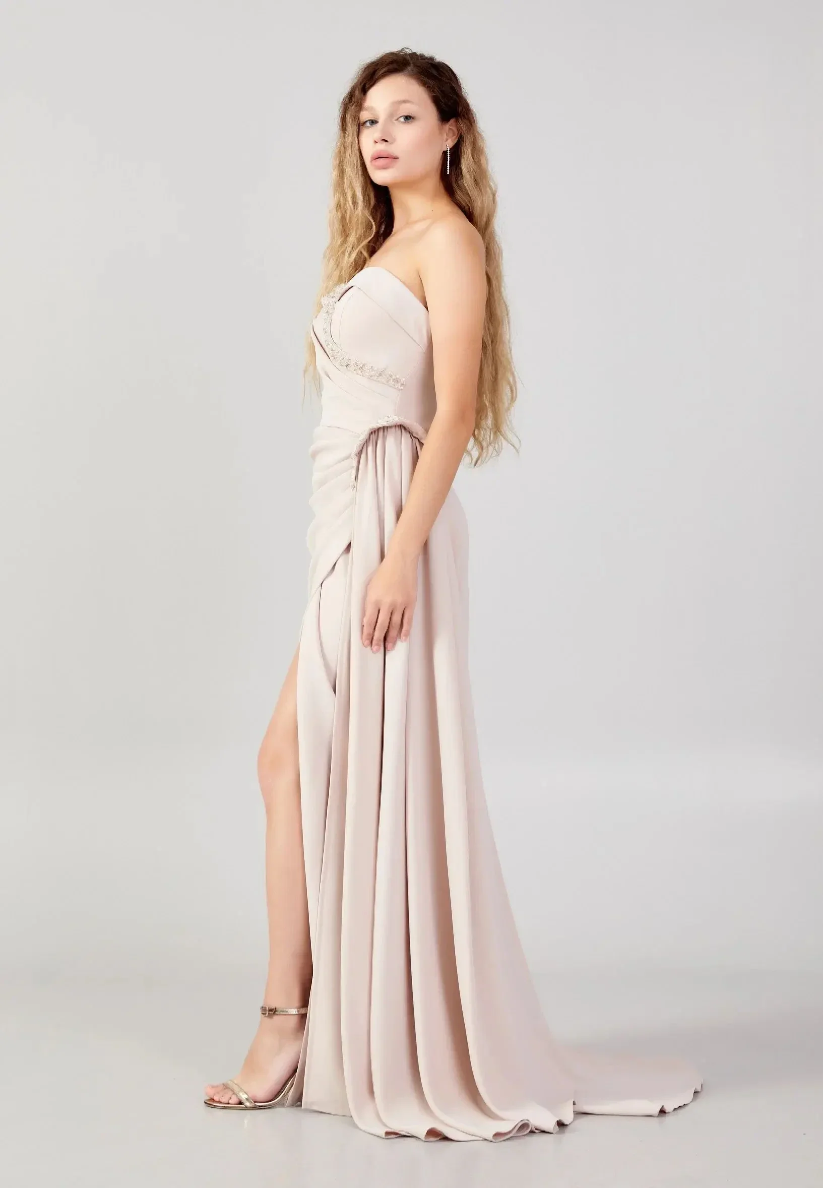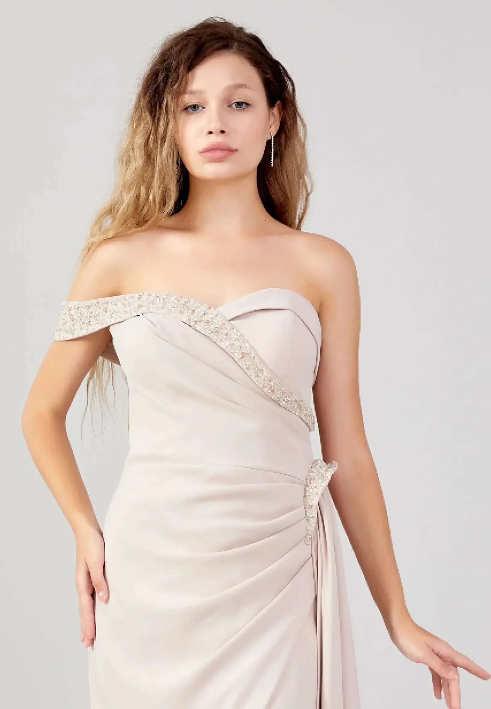 Detalji: Ukrašena je nizom dekorativnih bisera koji prate liniju dekoltea s jedne strane i spuštaju se prema struku gdje se tkanina nabire.