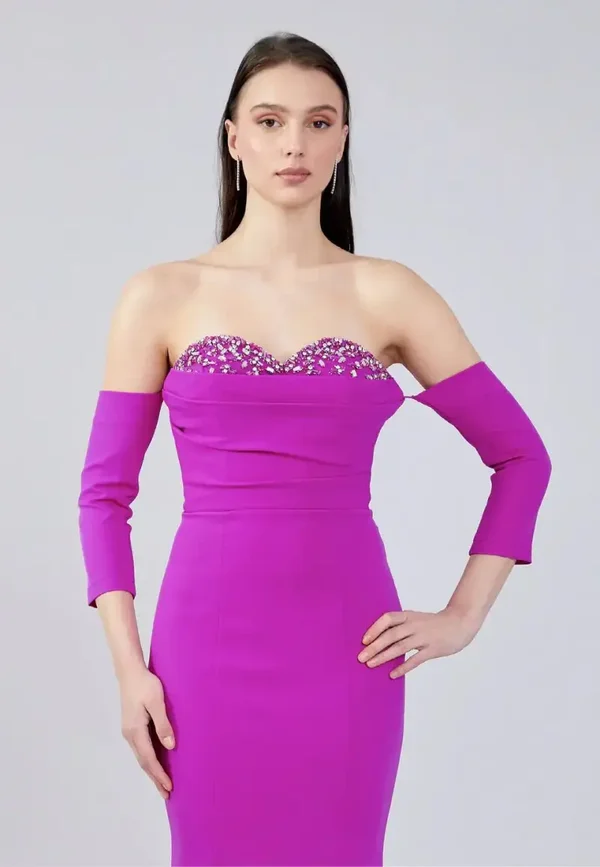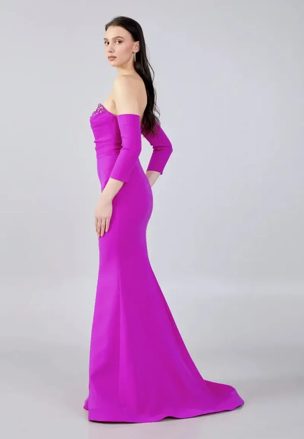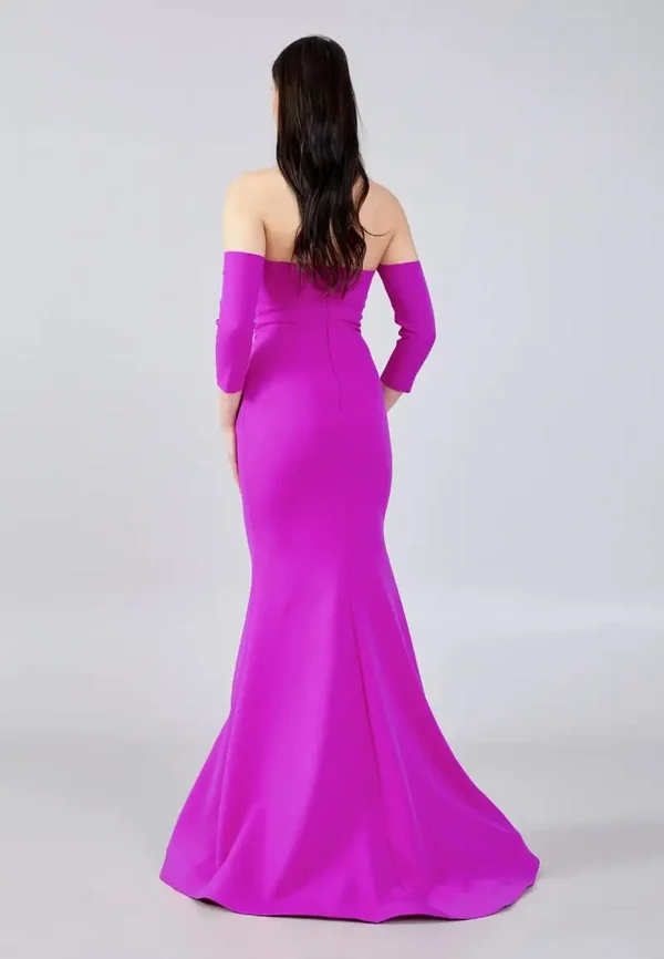Ova haljina je dugačka svečana fuksija (magenta) haljina "sirena" kroja, prepoznatljiva po svom elegantnom i modernom dizajnu s odvojivim rukavima. Ključne značajke dizajna: