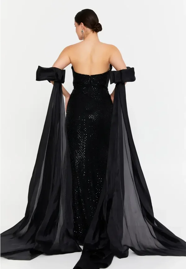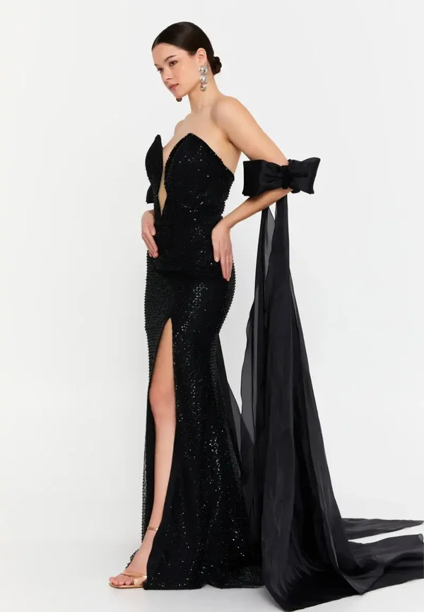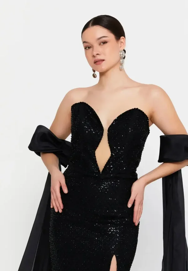 Ova haljina je dugačka crna svečana haljina sa šljokicama , koju karakterizira odvažan dizajn s naglašenim dekolteom i dramatičnim modnim dodacima. Ključne značajke dizajna: