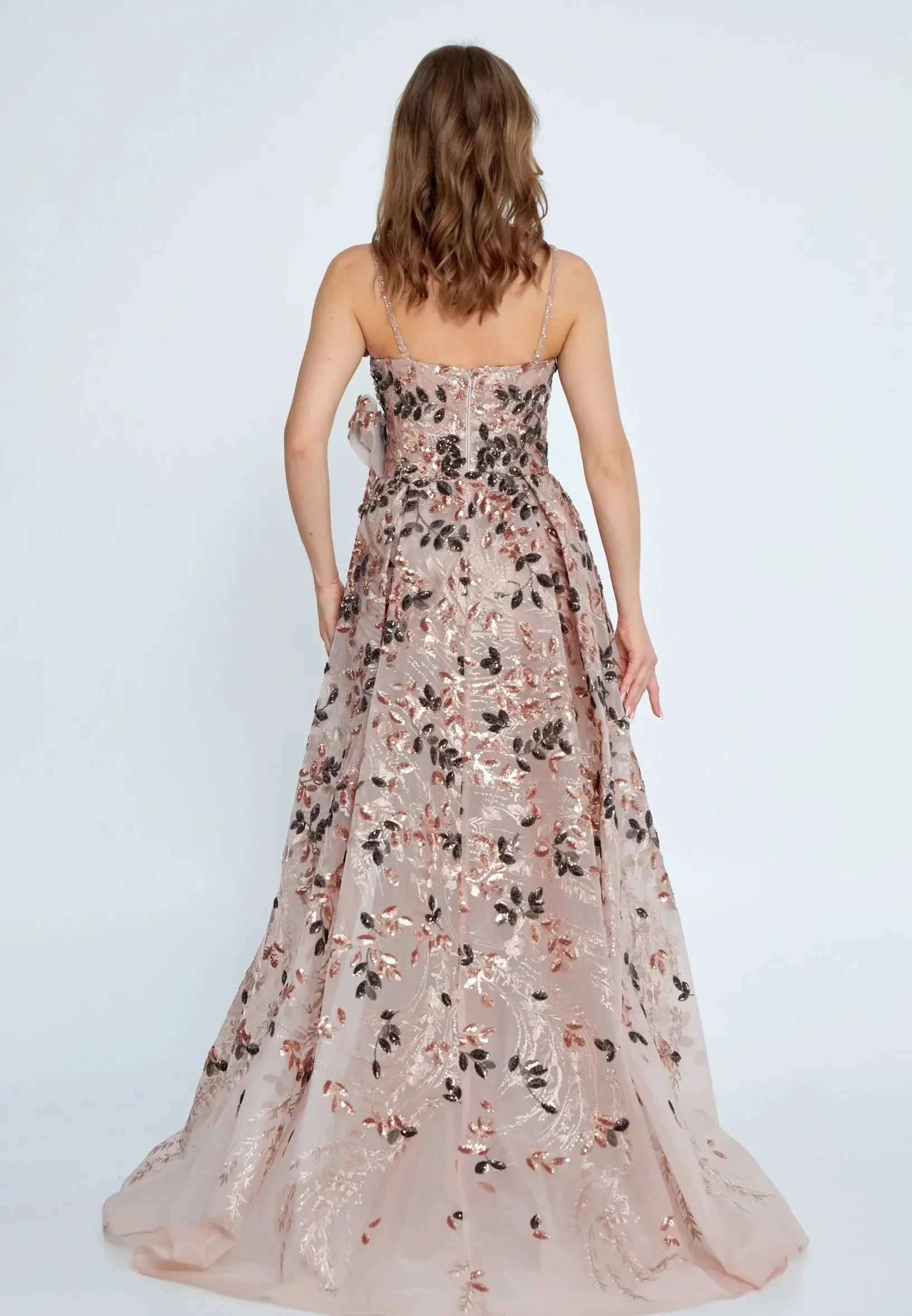 Gornji dio: Haljina ima korzetni gornji dio s tankim, decentnim naramenicama. Ukrašena je bogatim 3D vezom, perlicama i šljokicama u bakrenim i tamnim tonovima koji stvaraju efektan kontrast na svijetloj podlozi.