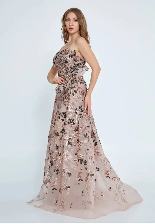 Ova haljina je dugačka svečana haljina A-kroja u boji pudera (champagne/puder roza) , prepoznatljiva po svom raskošnom vezu s motivima lišća i cvijeća. Ključne značajke dizajna: