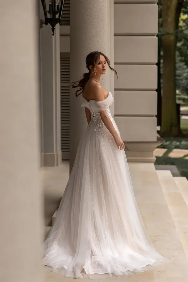 - Rukavi: Prepoznatljive "off-the-shoulder" naramenice koje ostavljaju ramena i dekolte otvorenima.