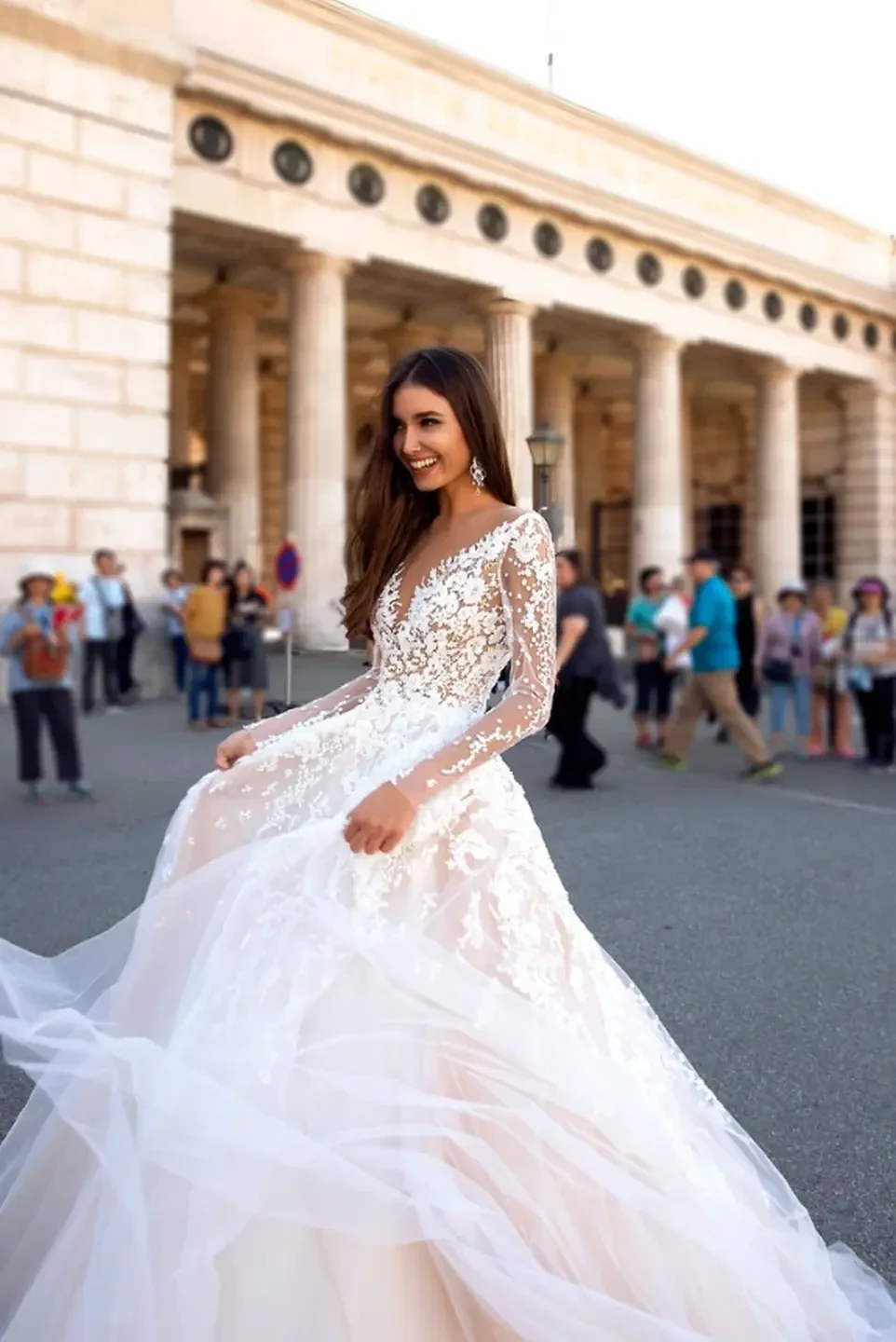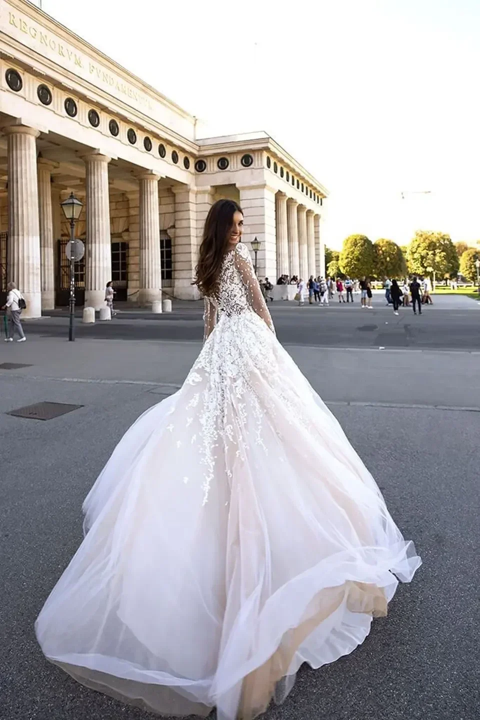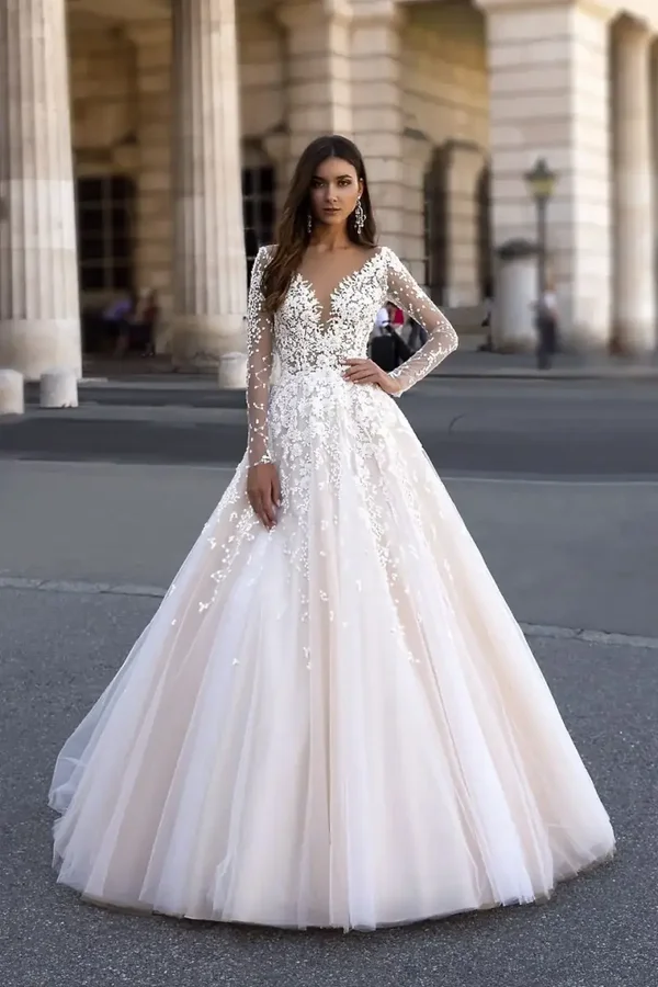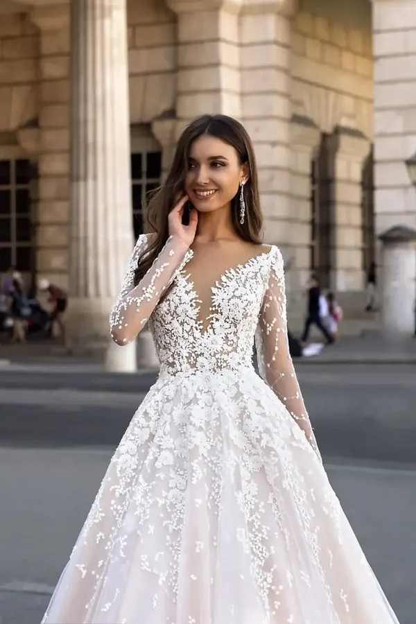 - Dizajn: Haljina je lagana vjenčanica A-kroja s dugim prozirnim rukavima od mreže i čipke.