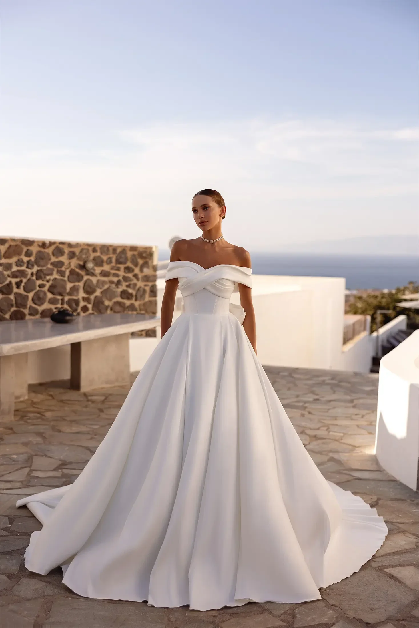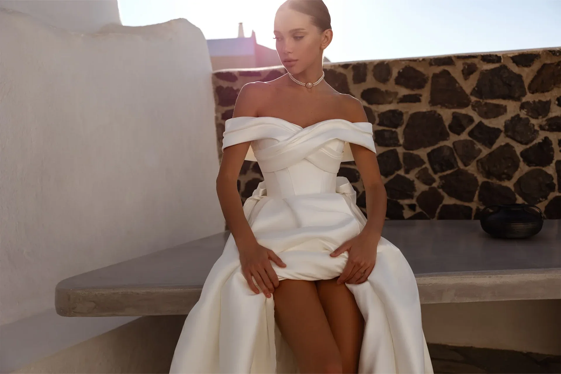 - Gornji dio: Ima elegantan off-shoulder dizajn (spuštena ramena) s isprepletenim (criss-cross) detaljima na poprsju i strukturiranim korzetom koji naglašava struk.