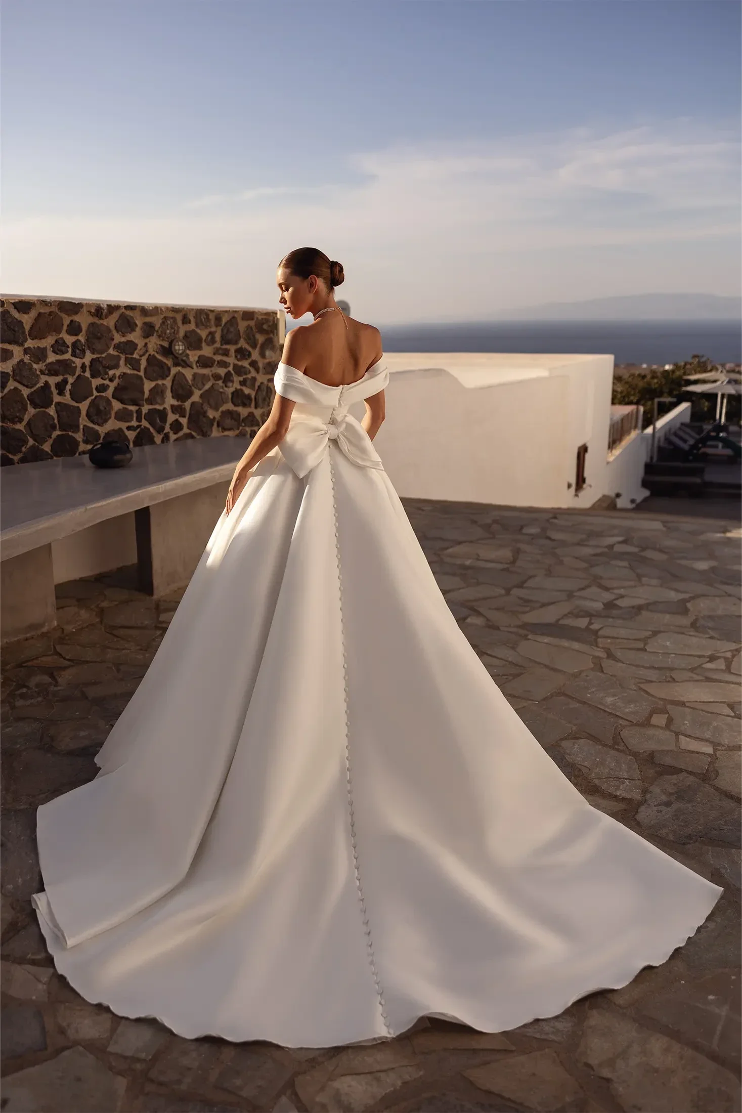 - Poseban detalj: Na leđima se nalazi upečatljiva, velika ukrasna mašna i niz prekrivenih gumbića koji se protežu cijelom dužinom šlepa, dodajući dašak regallnosti
