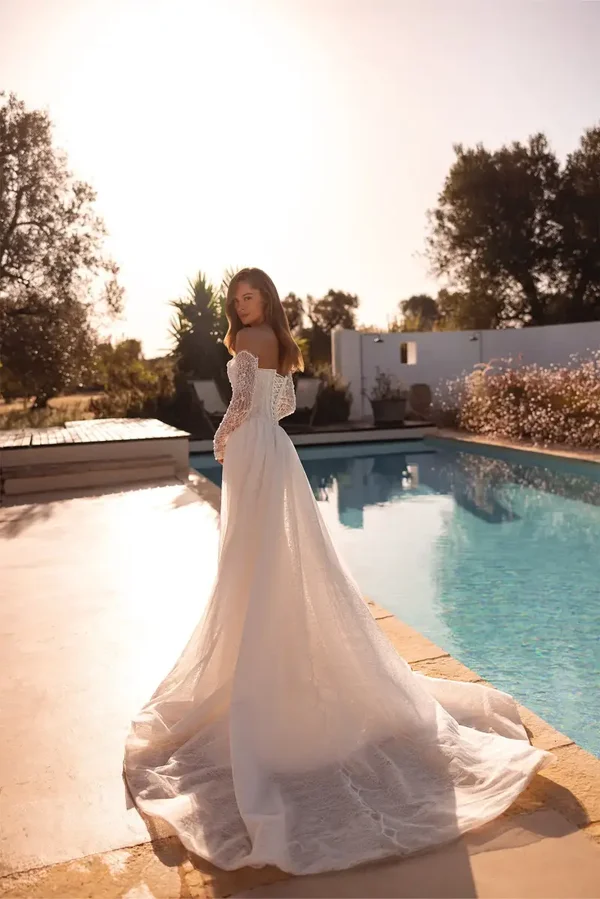 - Detalji: Cijela haljina je ukrašena kristalima i čipkom, a poseban naglasak daju odvojivi čipkasti rukavi.