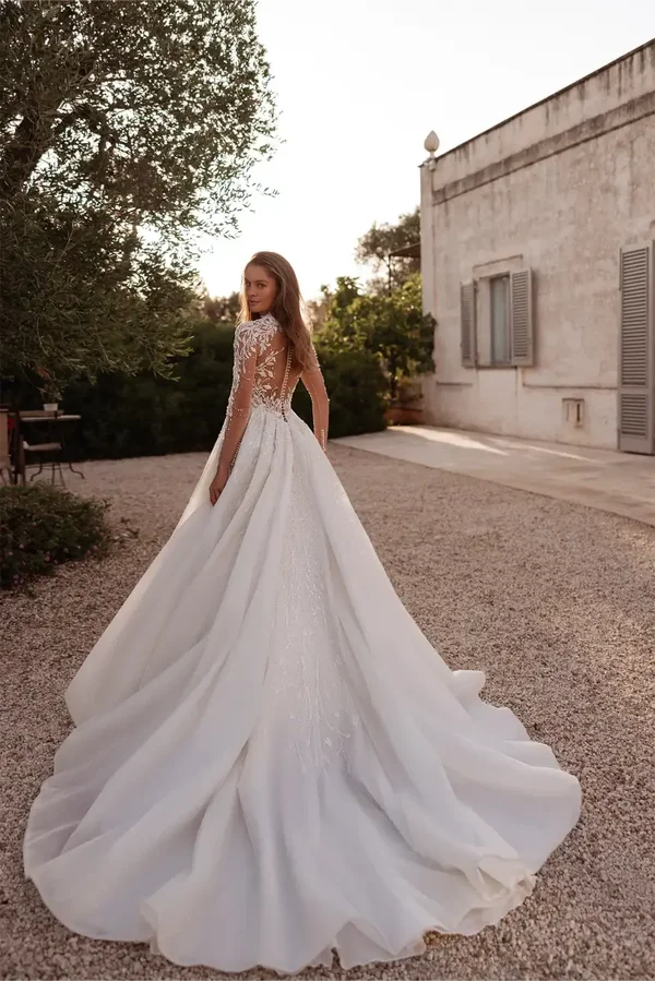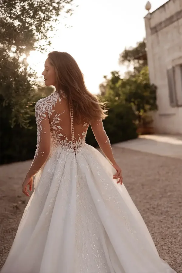 - Dizajn gornjeg dijela: Visoki ovratnik ("high neck") s prozirnim tilom i bogatim cvjetnim aplikacijama koje se spuštaju niz korzet.