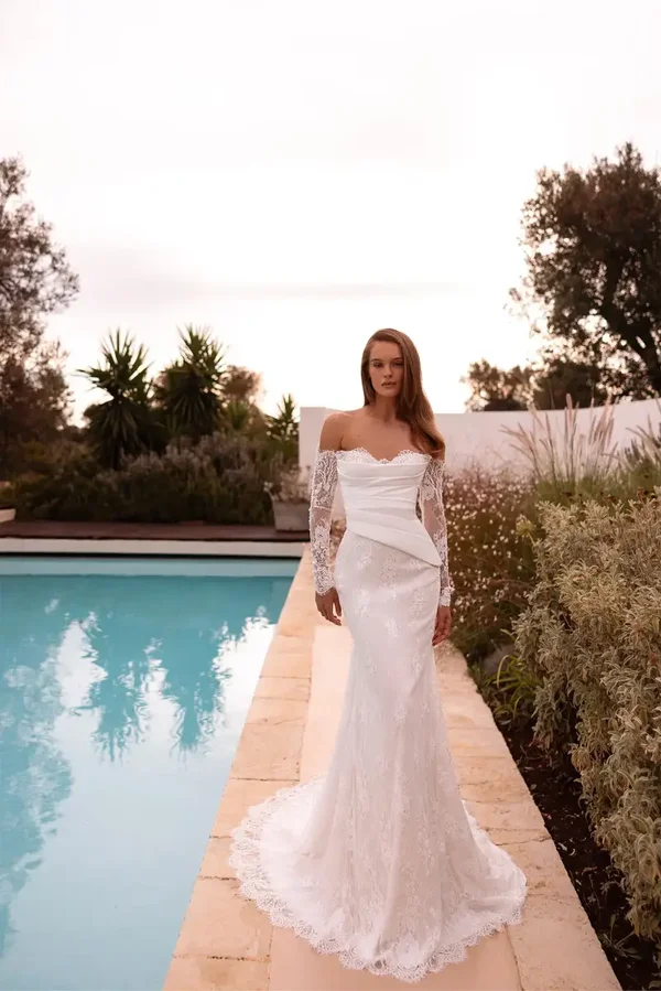 - Rukavi: Ima duge, prozirne čipkaste rukave koji se nose spušteno na ramenima.