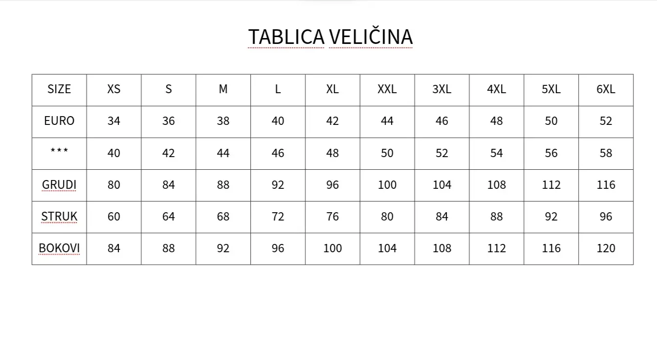 Sve narudžbe prihvaćaju se u proizvodnju prema gornjoj tablici veličina EURO